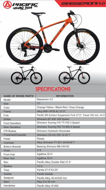 Belanja pacific 27 5 mtb masseroni 4 0. Perputaran roda yang lebih lebar dan didukung oleh opsi percepatan gear hingga 24 speed 3 depan dan 8 belakang dari shimano. Untuk anda yang masih bingung dalam memilih sepeda pacific yang akan dibeli sesuai dengan budget anda.